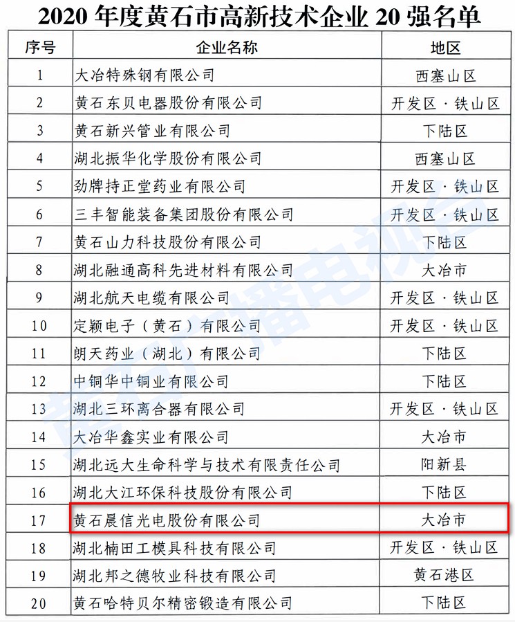 黃石晨信光電股份有限公司榮獲2020年度“黃石市高新技術(shù)企業(yè)20強(qiáng)”